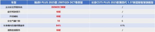 综合看来,瑞虎8 PLUS凭借更完备的安全配置,在安全性能上全面领先长安CS75 PLUS,给驾乘者满满的安全感。