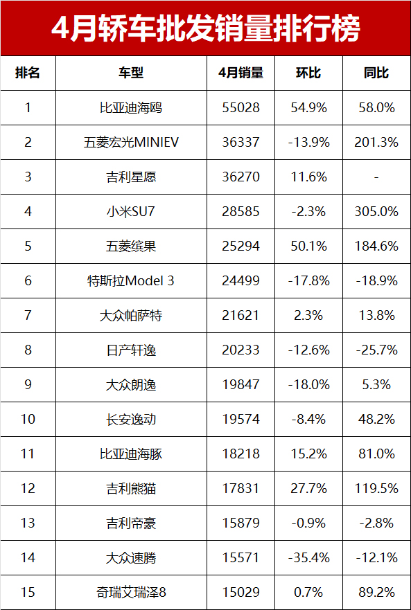 小米SU7在4月销量达到28585辆,同比增长305.0%,尽管环比微降2.3%,但凭借着小米品牌的科技光环和产品自身的智能配置,在中高端新能源轿车市场站稳脚跟。五菱缤果同样表现出色,销量25294辆,环比增长50.1%,同比增长184.6%,销量近乎翻倍,排名第五位,成为小型车市场的一匹“黑马”。