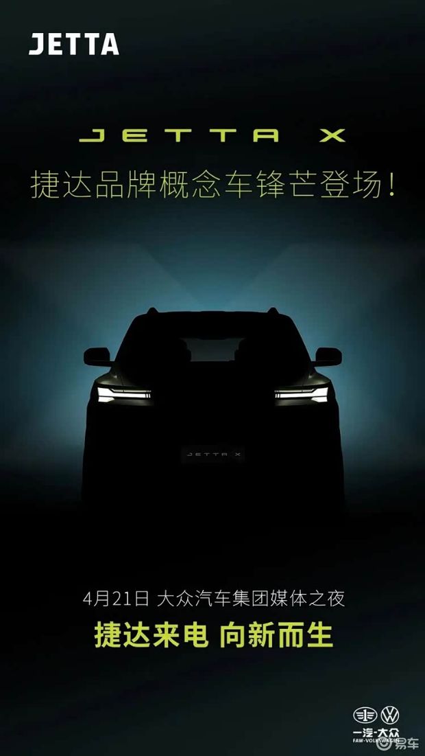 4月17日,捷达品牌发布了一张JETTA X概念车预告图,并宣布新车将于4月21日举办的大众集团之夜上正式发布。据悉,JETTA X概念车随后也将亮相北京车展。
